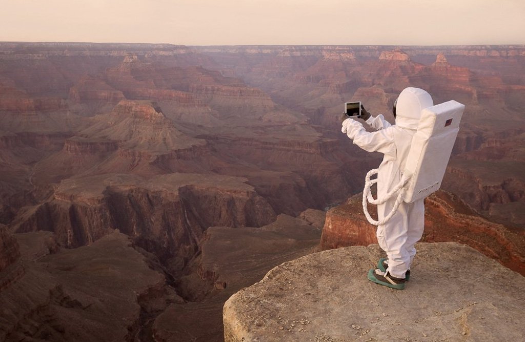 Освен невероятните пейзажи, серията снимки разкрива и как начинът, по който се снимаме днес, е знак на суетата и непрекъснатия стремеж към самоопределяне. Затова и астронавтът на снимките позира в типичните туристически пози.